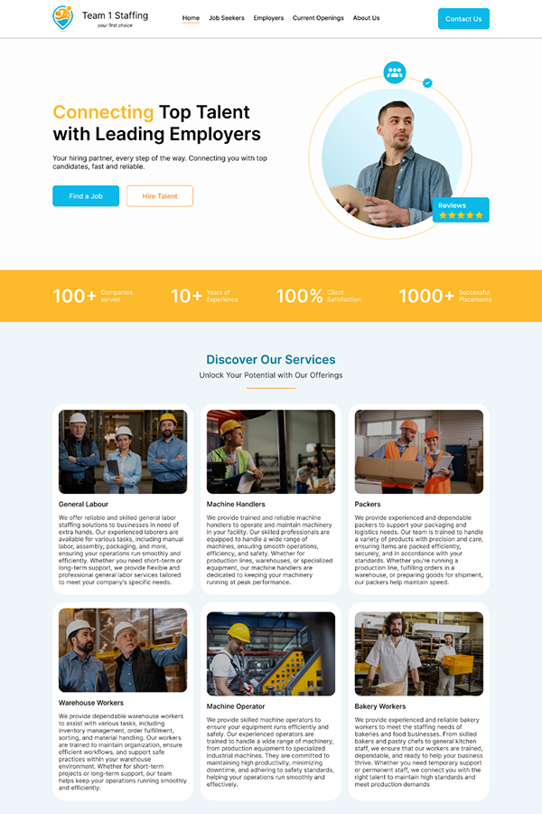 We simplified the layout. Everything is now easy to find; you no longer need to dig for things. You can easily find the CTA buttons with just a few clicks for hiring or job hunting. The homepage now clearly explains who Team1 is and how they help. It also features key highlights like 24/7 support and industry experience.
