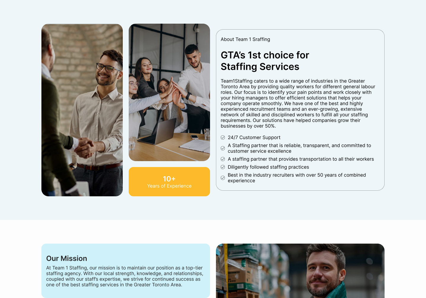 Team1 Staffing is a trusted staffing agency. It’s based in the Greater Toronto Area. They help job seekers find the most suitable roles for them and support employers in hiring top talent. With all the experience that they have, Team1 has built strong local relationships and a reputation for delivering reliable staffing solutions. Their recruitment team brings over 50 years of combined expertise. They are helping companies fill general labour roles across various industries.